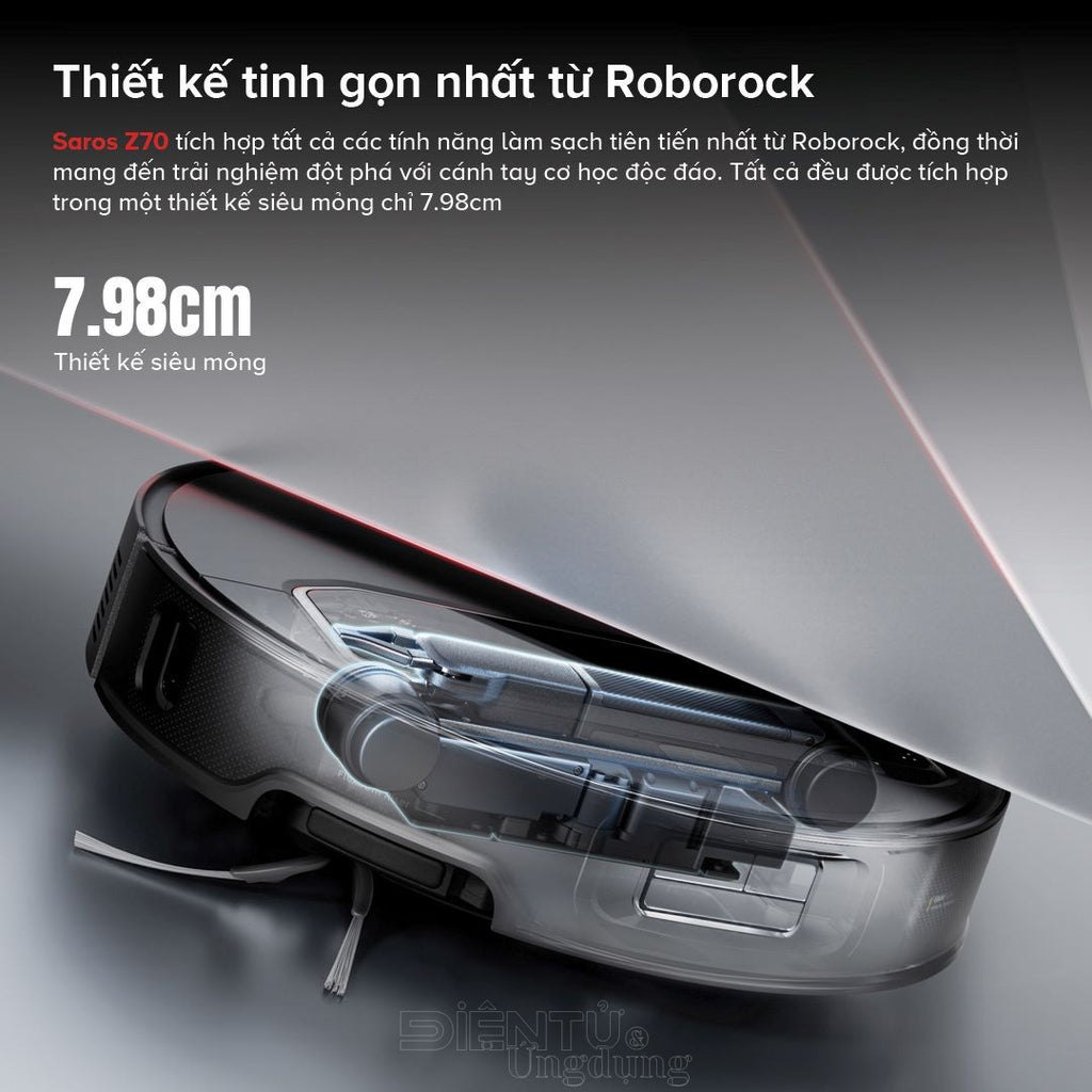 Dù tích hợp cánh tay cơ học, nhưng Roborock Saros Z70 vẫn sở hữu thiết kế siêu mỏng, chỉ 7.98cm