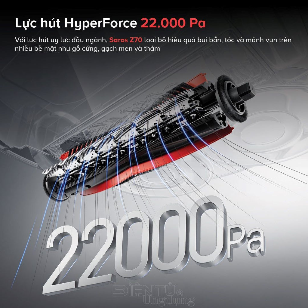 Nói về hiệu suất làm sạch thì Roborock Saros Z70 đang được đánh giá là hàng đầu nhờ lực hút HyperForce mạnh mẽ lên đến 22.000Pa, dẫn đầu trong ngành, giúp dễ dàng loại bỏ bụi mịn, tóc, lông thú cưng và các mảnh vụn cứng đầu trên mọi bề mặt, từ sàn gỗ, gạch men đến thảm lông dày.