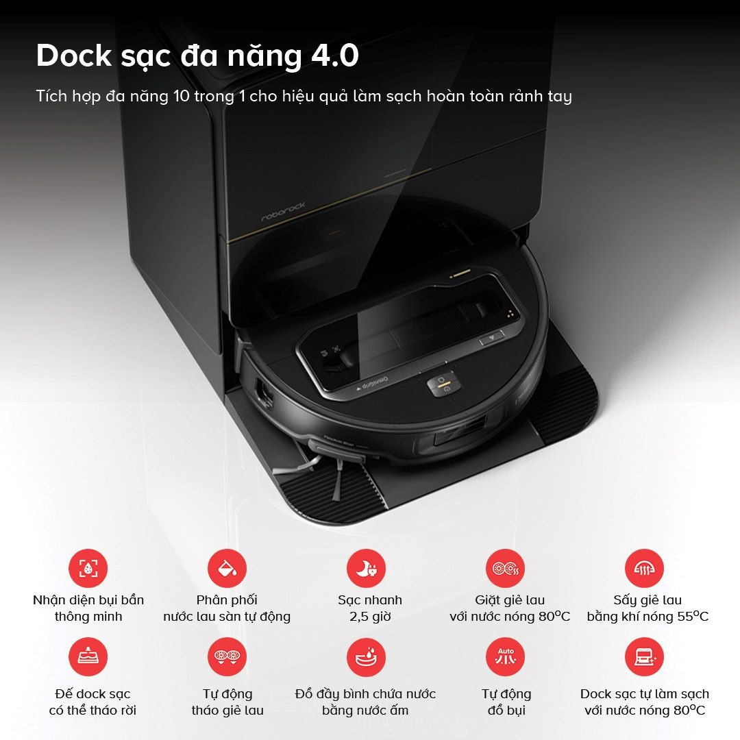 Ngoài ra, Roborock Saros Z70 còn mang đến trải nghiệm tự động hóa toàn diện với dock sạc đa năng 4.0, tích hợp loạt tính năng tiên tiến như giặt giẻ và vệ sinh dock bằng nước nóng, sấy khô bằng khí nóng, tự động đổ bụi và châm nước lau sàn. Nhờ đó, người dùng hoàn toàn không cần thao tác thủ công trong quá trình vận hành và bảo trì thiết bị.