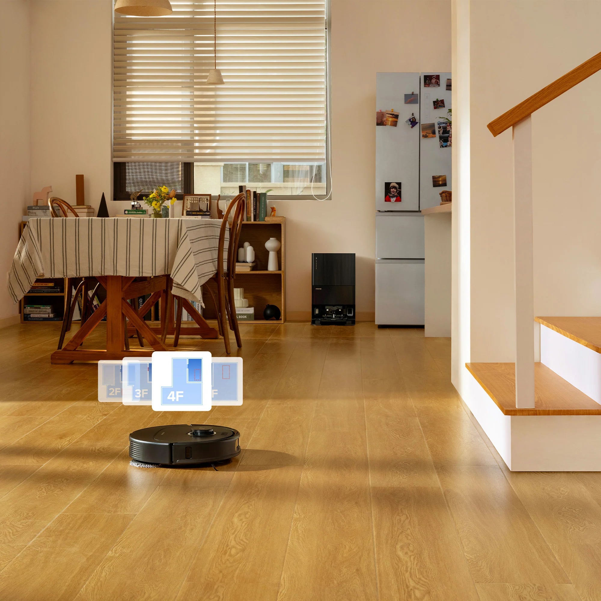 Chỉ cần đặt xuống và robot tự động nhận diện các tầng khác nhau trong nhà. Tối đa lên đến 4 tầng.