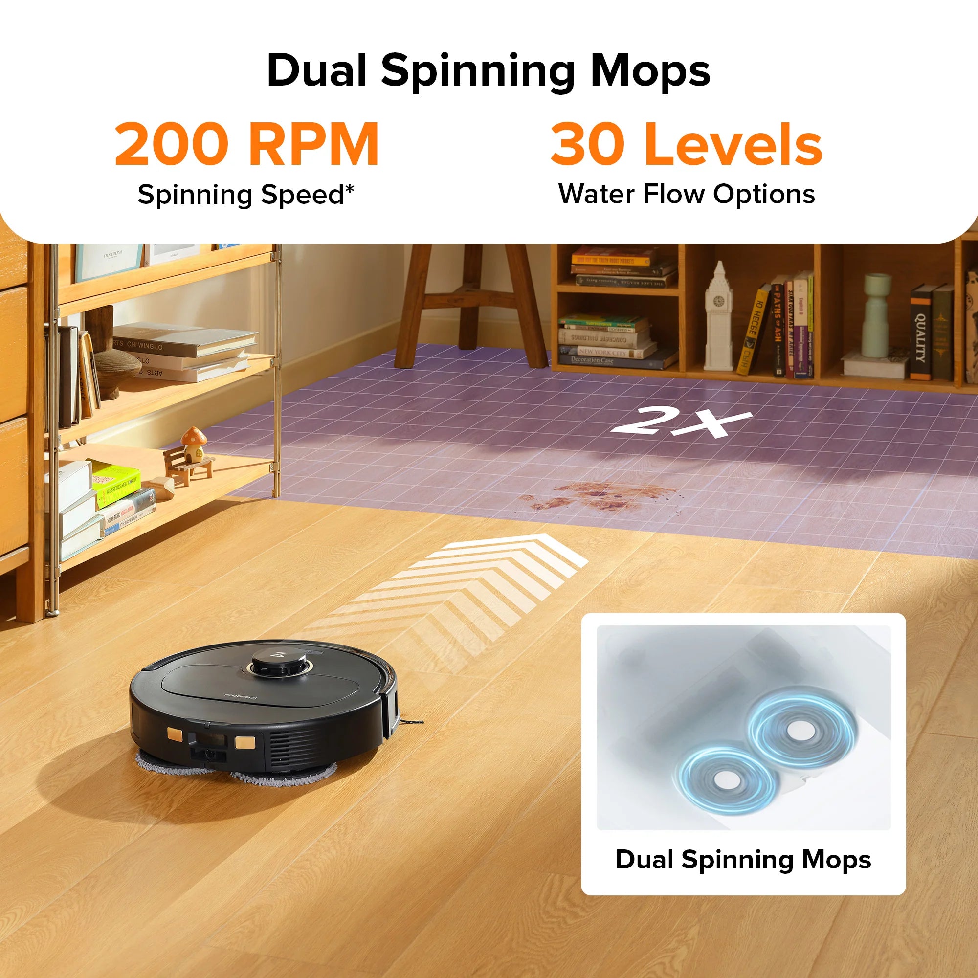 - Giẻ lau xoay kép với tốc độ quay 200 vòng/phút và 30 cấp độ tùy chỉnh