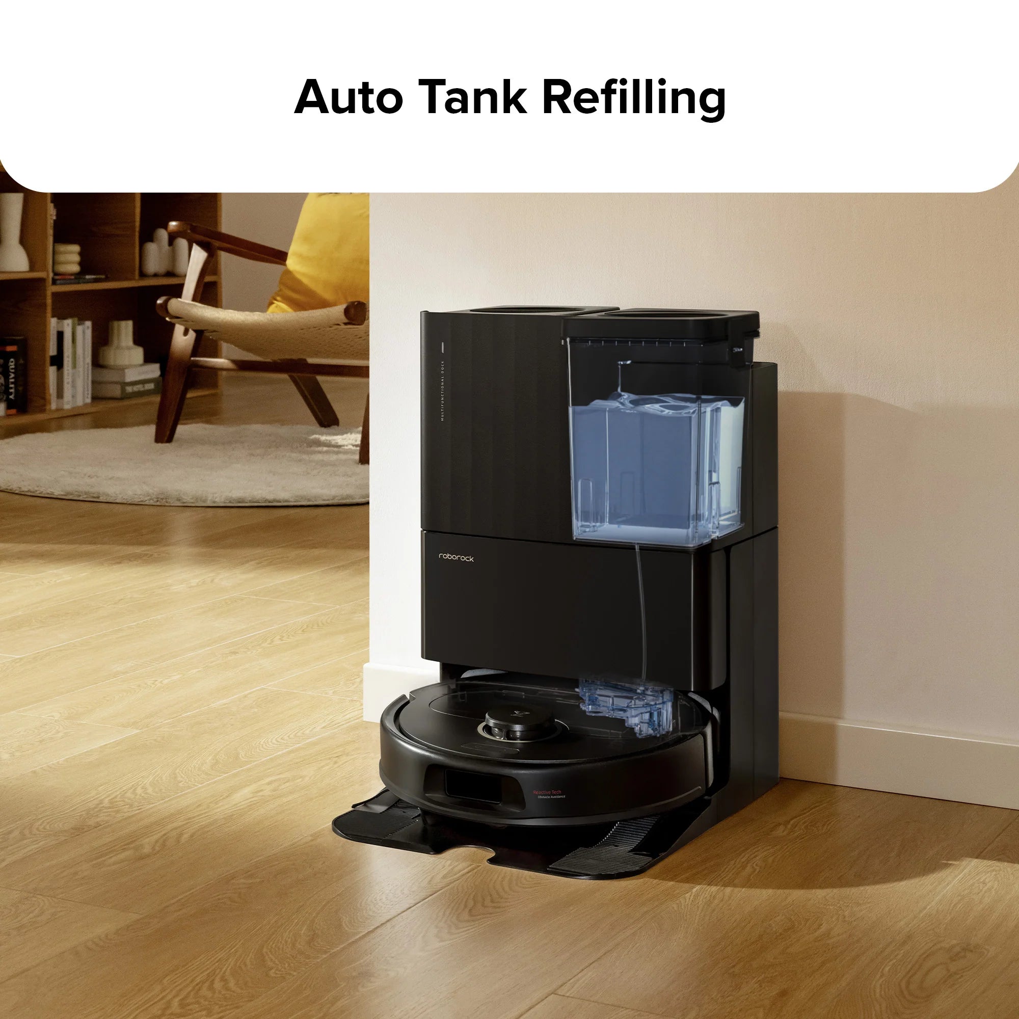 Tự động làm đầy bình chứa nước khi cần. Robot có thêm chức năng tự động phân phối nước lau sàn*, cho phép tự động nạp và xả nước. Máy pha nước lau sàn tự động thêm một lượng nước lau sàn vừa đủ vào bình nước sạch, giúp làm sạch một cách dễ dàng.