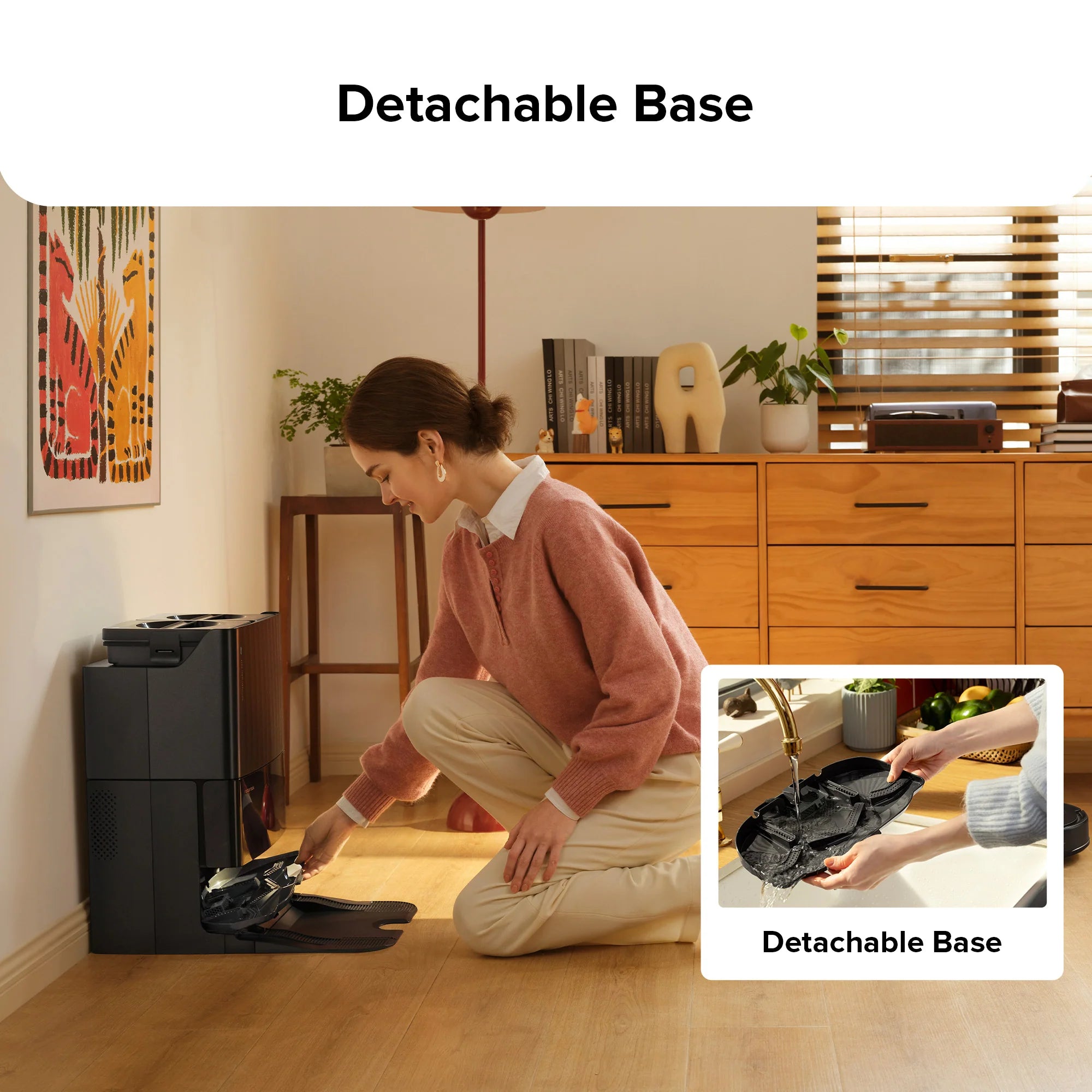 Dễ dàng tháo đế trạm sạc thuận tiện vệ sinh. Cấu trúc thiết kế cải tiến với bộ lọc lớn ít cần vệ sinh thủ công.