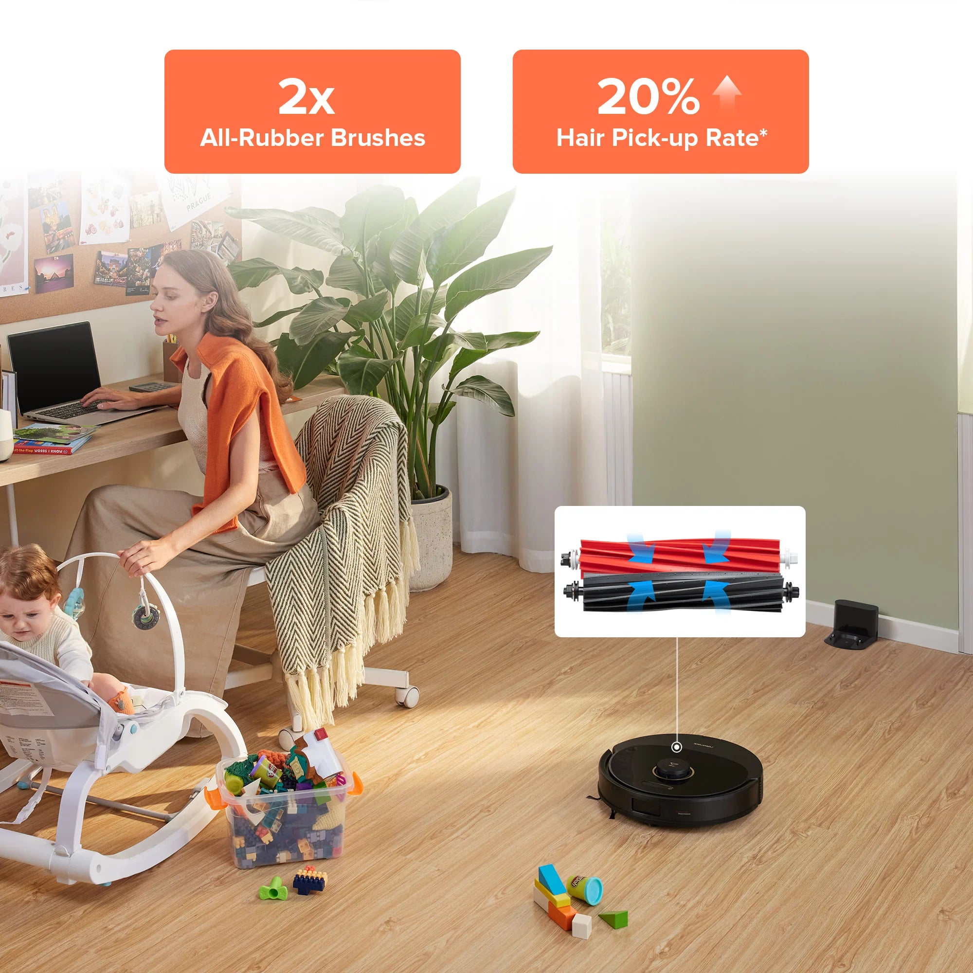 Bàn chải con lăn kép cải thiện đáng kể khả năng hút lông và loại bỏ bụi bẩn trên thảm và các loại mặt sàn khác nhau*.