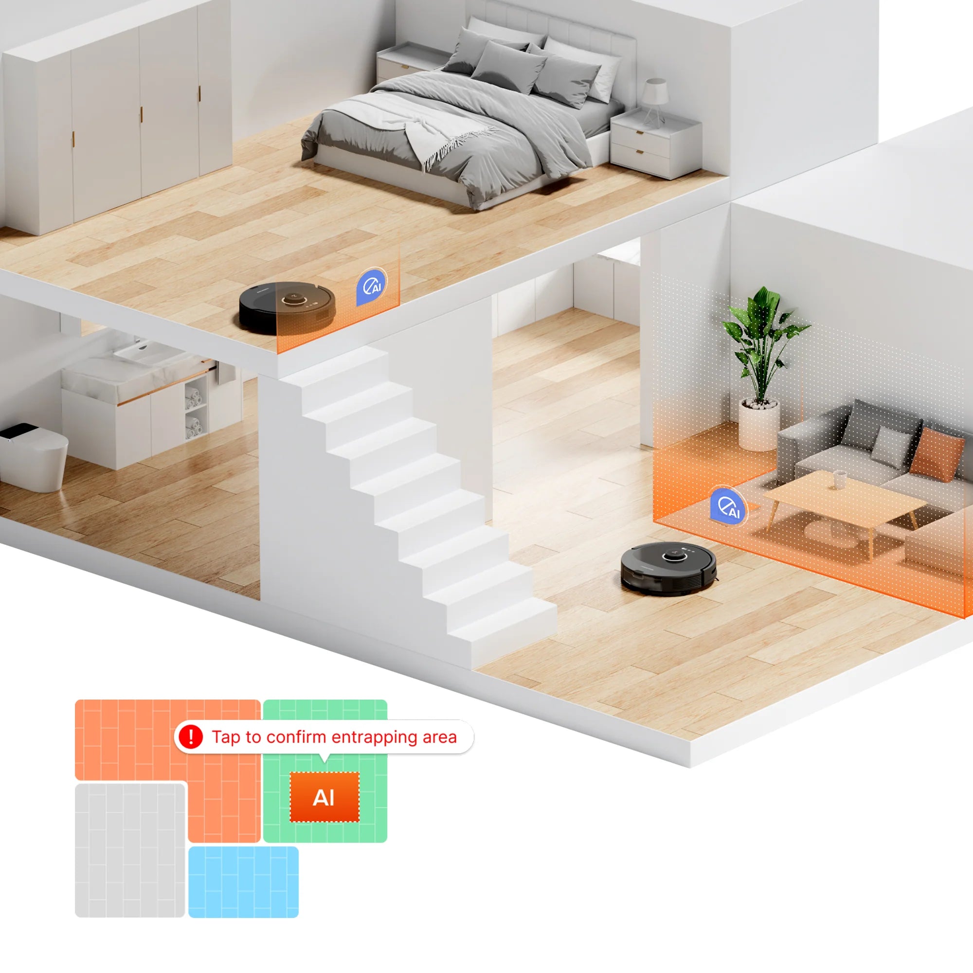 Tự động phát hiện những khu vực dễ mắc kẹt và đề xuất khu vực không nên đi. Vẽ tường ảo để chặn một số khu vực nhất định trong Ứng dụng Roborock.