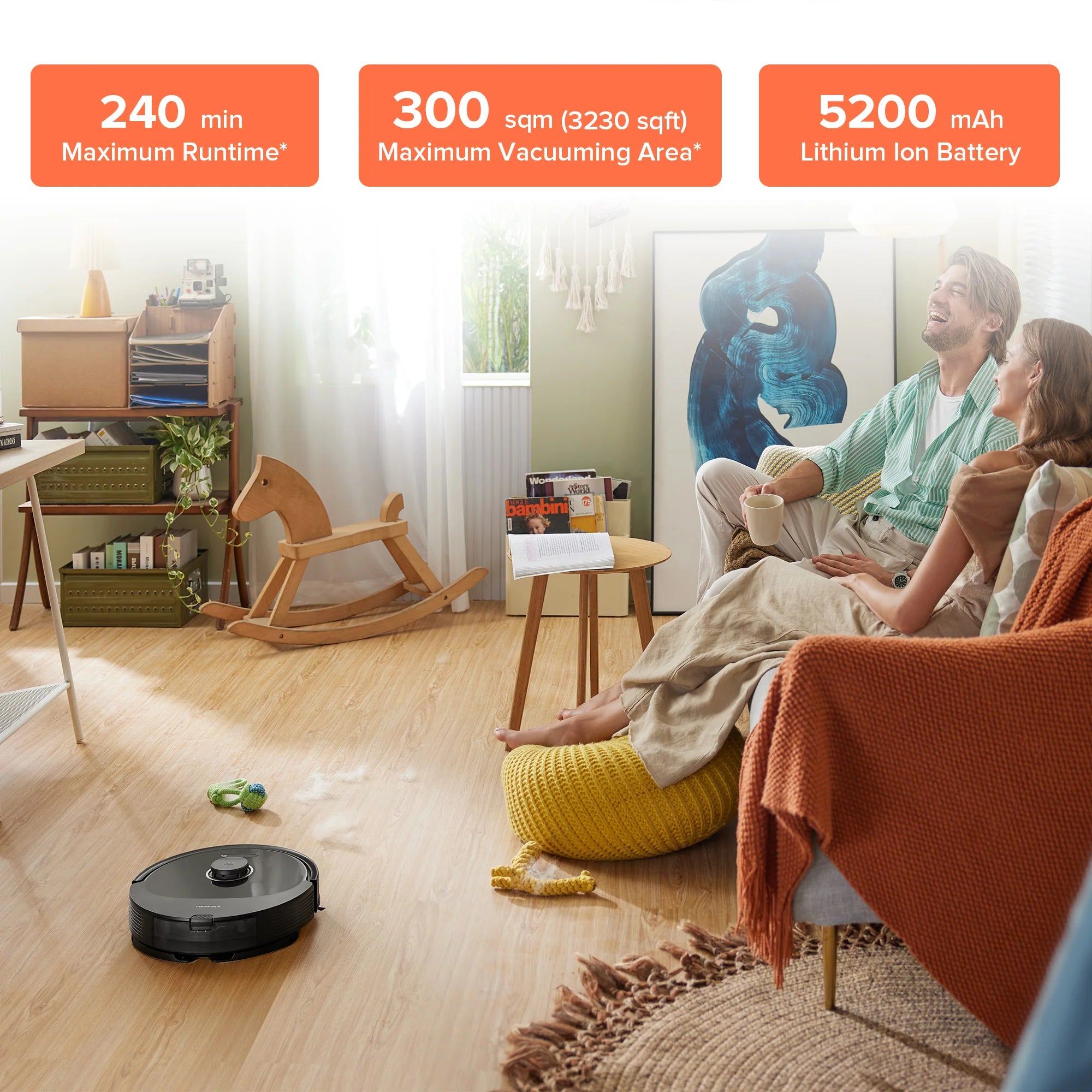 Được trang bị pin mạnh mẽ 5200mAh, Q8 Max có thể làm sạch liên tục trong tối đa 4 giờ, đảm bảo các phiên làm sạch kéo dài mà không bị gián đoạn. Diện tích hút bụi tối đa có thể lên tới 300 m2*